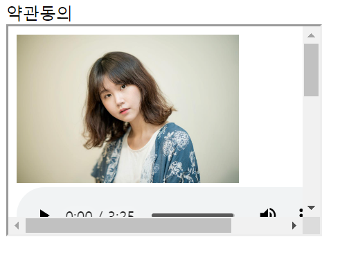 <html lang="ko"><head><title>07_iframe.html</title></head><body><!-- 프레임 삽입 -->약관동의<br><iframe src="06_미디어.html" width="300" height="200"></iframe>