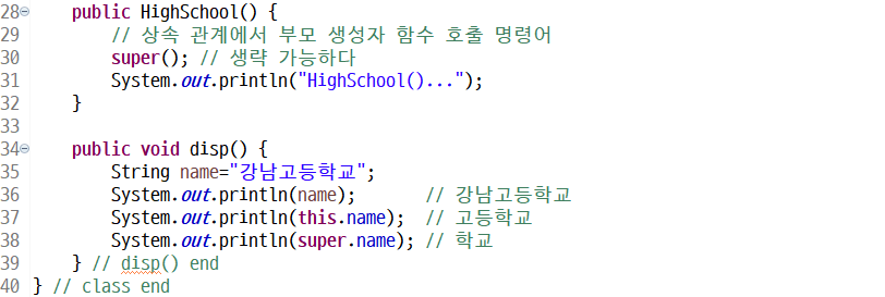 이 상태로 HighSchool 클래스에 disp() 함수를 호출하면 강남고등학교가 출력되는 것을 확인할 수 있다.