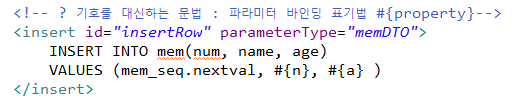 <!-- ? 기호를 대신하는 문법 : 파라미터 바인딩 표기법 #{property}-->
